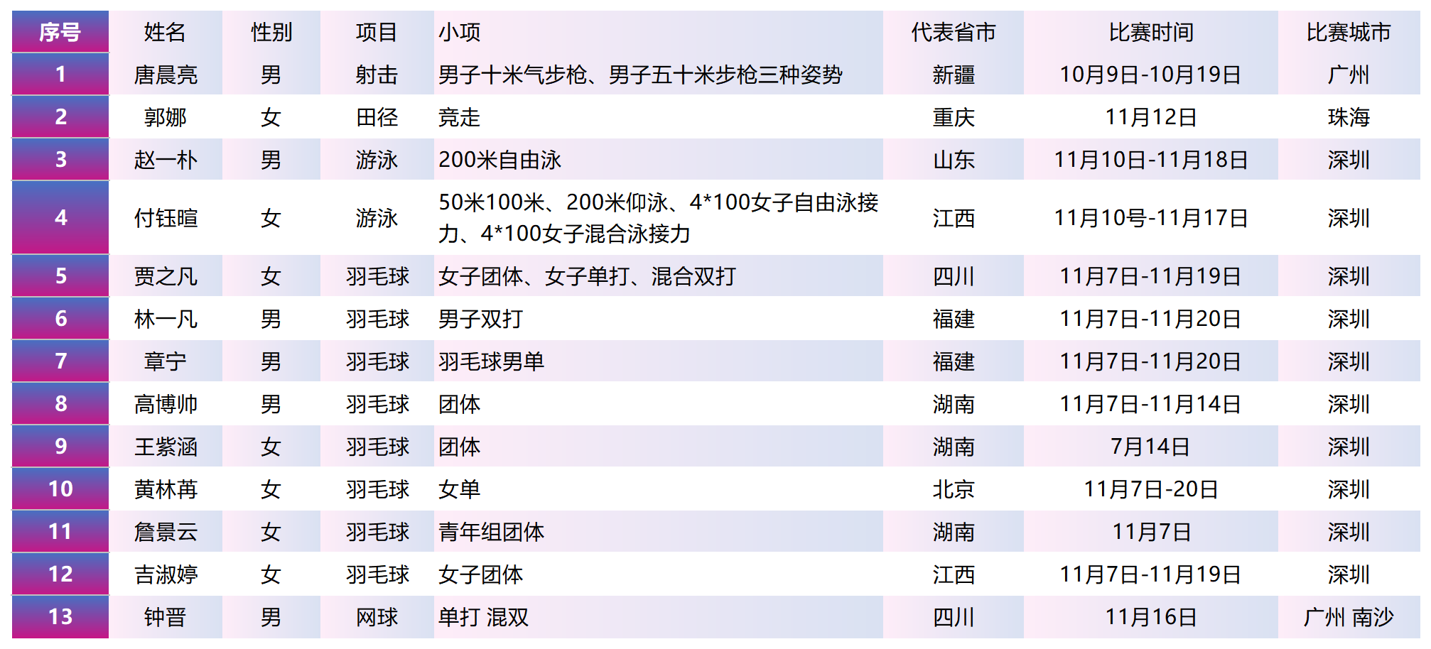 第十届全国运动会(以下简称“全运会”)的战幕即将在粤港澳拉开。万博体育app 11名优秀学子与2名青年教师已凭借出色的竞技水平和扎实的训练成果,成功获得全运会决赛阶段的入场券,将代表多个省市出征这一全国体育盛会,在赛场上展现重大人的飒爽英姿。